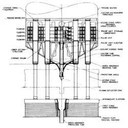 Au lieu d'une configuration chambre de combustion-tuyère, le concept d'Orion était d'éjecter des charges à fission à l'arrière du véhicule et de les faire exploser à 60 m (200 pieds), récupérant le souffle sur une épaisse plaque de poussée en acier ou en aluminium. D'énormes amortisseurs étagés devaient absorber l'onde de choc du plasma frappant la plaque de poussée, transformant les 50 000 g[D 2] subis par la plaque pendant une milliseconde en une poussée constante.