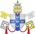 | 32. | De la bénédiction des flots | Boniface VIII (1294–1303) | Benedetto Caetani | Anciennement nommé Benoît, de Gaeta, dont les armes portent des vagues. Les armes de Boniface VIII sont traversées par « une jumelle ondée d'azur », deux lignes de vagues parallèles. La devise constitue également un jeu de mots sur le lieu de naissance de Boniface VIII — il a vu le jour à Gaeta, ville maritime du Latium — et sur son prénom — Benedetto signifie également béni[51],[52]. | ![]() |