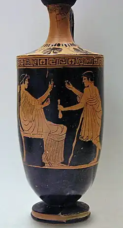 Parallèlement, les lois réprouvent très sévèrement les relations hors mariage avec une femme libre — dans le cas d'un adultère, le mari trompé a le droit de tuer l'offenseur pris en flagrant délit[A 1] — de même que le viol. L'âge moyen du mariage étant 30 ans pour les hommes, le jeune Athénien n'a pas d'autre choix, s'il veut avoir des relations hétérosexuelles, que de se tourner vers ses esclaves ou vers les prostituées. L'existence d'une prostitution féminine à destination des femmes est mal attestée. L'Aristophane du Banquet de Platon mentionne des ἑταιρίστριαι / hetairístriai dans son célèbre mythe sur l'Amour : selon lui, « les femmes issues des portions de femmes primitives n'ont pas grand goût pour les hommes : elles préfèrent les femmes, et c'est de là que viennent les hetairístriai »[2],[3] ; il pourrait s’agir de prostituées s'adressant à une clientèle lesbienne[A 2]. Lucien de Samosate s'étend sur cette pratique dans ses Dialogues des courtisanes[4],[5] ; il est possible qu'il s'agisse d'une allusion au passage du Banquet de Platon.