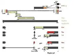 Le génome du virus HTLV-1 code cette protéine. En fait, HTLV-1 est un rétrovirus complexe dont le génome a la propriété de coder des protéines régulatrices en plus des protéines structurales et des enzymes viraux. Ce virus est le seul à être responsable d’un cancer chez l’être humain. Il a la particularité d’avoir deux cadres de lecture supplémentaires par rapport aux autres rétrovirus. Cela constitue la région pX qui code les protéines non-structurales, dont Tax fait partie, qui régulent l’expression du virus et les relations entre le virus et la cellule hôte. En raison de cette dernière fonction, Tax est localisée de façon hétérogène dans la cellule et porte des signaux d’importation et d’exportation du noyau. HLTV-1 sécrète Tax sous forme active[1].