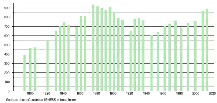 L'évolution du nombre d'habitants est connue à travers les recensements de la population effectués dans la commune depuis 1793. À partir du , les populations légales des communes sont publiées annuellement dans le cadre d'un recensement qui repose désormais sur une collecte d'information annuelle, concernant successivement tous les territoires communaux au cours d'une période de cinq ans. Pour les communes de moins de 10 000 habitants, une enquête de recensement portant sur toute la population est réalisée tous les cinq ans, les populations légales des années intermédiaires étant quant à elles estimées par interpolation ou extrapolation[12]. Pour la commune, le premier recensement exhaustif entrant dans le cadre du nouveau dispositif a été réalisé en 2008[13],[Note 1].