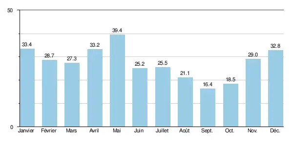| Précipitations (mm) | 33,4 | 28,7 | 27,3 | 33,2 | 39,4 | 25,2 | 25,5 | 21,1 | 16,4 | 18,5 | 29 | 32,8 | 330,5 |