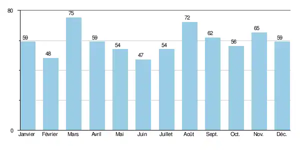 | Précipitations (mm) | 56 | 48 | 75 | 59 | 54 | 47 | 54 | 72 | 62 | 56 | 65 | 59 | 707 |