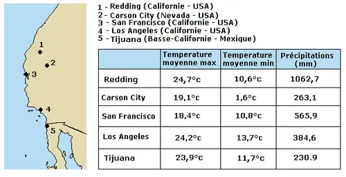 Le climat est globalement méditerranéen selon la Classification de Köppen avec des étés chauds et secs et des hivers doux et pluvieux. Néanmoins l'étirement important de cette zone ainsi que l'influence combinée de l'Océan Pacifique et des différentes chaînes de montagnes de cette province permettent l'apparition de nombreux microclimats. La pluviométrie peut foncièrement varier entre le sud semi-aride et chaud et le nord beaucoup plus arrosé et plus frais. La carte à droite montre les variations de température et de précipitations notables entre 5 points de la province floristique de Californie. De ce fait il apparaît un grand nombre d'écosystèmes: steppes d'armoises, chaparral, forêts de genévriers, pins, sapins, séquoias, sapins de Douglas sempervirentes tempérées, dunes, marais salants, etc.
