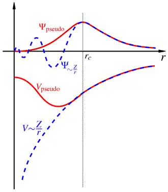 La fonction d'onde réelle est ensuite remplacée par une pseudofonction d'onde à laquelle est associée un potentiel modèle (le pseudopotentiel) choisi pour reproduire correctement les propriétés des états de valence. Le schéma mathématique qui permet de générer la pseudofonction d'onde n'est pas unique. Il existe du point de vue mathématique une certaine liberté dans le choix de la méthode comme en témoignent les nombreuses publications qui présentent différentes manière de faire[11],[12],[13],[14],[15],[16],[17],[18].
