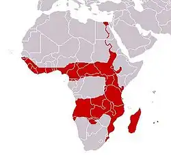 Cette espèce se rencontre en Afrique du Sud, en Angola, au Botswana, au Cameroun, en Côte d'Ivoire, en Égypte, en Éthiopie, au Gabon, au Ghana, en Guinée, en Guinée équatoriale, en Guinée-Bissau, au Kenya, au Liberia, à Madagascar, au Malawi, en Mauritanie, au Mozambique, en Namibie, au Nigeria, en République centrafricaine, en République démocratique du Congo, en République du Congo, au Rwanda, au Sénégal, en Sierra Leone, au Soudan, au Soudan du Sud, en Tanzanie, en Zambie et au Zimbabwe[1],[2].