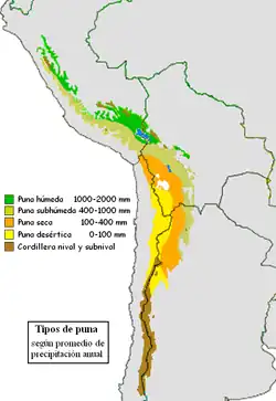 La puna s'étend sur le sud-est du Pérou, le sud-ouest de la Bolivie, l'extrême nord-est du Chili, et le nord-ouest argentin ou NOA. Dans cette zone, les précipitations diminuent du nord au sud, si bien que la puna péruvienne peut être considérée comme bien arrosée (les surplus de précipitations contribuant à y créer le grand lac Titicaca), tandis que la puna argentine de la province de Catamarca (département d'Antofagasta de la Sierra) et de Salta (département de Los Andes) est désertique et quasi inhabitée.
