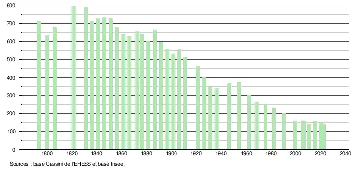 L'évolution du nombre d'habitants est connue à travers les recensements de la population effectués dans la commune depuis 1793. Pour les communes de moins de 10 000 habitants, une enquête de recensement portant sur toute la population est réalisée tous les cinq ans, les populations de référence des années intermédiaires étant quant à elles estimées par interpolation ou extrapolation[22]. Pour la commune, le premier recensement exhaustif entrant dans le cadre du nouveau dispositif a été réalisé en 2005[23].