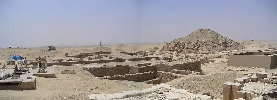 La pyramide dominait l'ensemble avec son revêtement en calcaire fin dont une partie est visible au sud du monument. La base mesure 57,7 m et la hauteur est de 43 m.