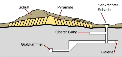 L'entrée des infrastructures se trouve au nord-est, une disposition qui sera sans précédent jusqu'à la construction de la pyramide de Sésostris II, près de 1000 ans plus tard. Les égyptologues Vito Maragioglio et Celeste Rinaldi ont proposé que cette caractéristique unique ait été choisie par les architectes égyptiens afin de libérer le côté nord de la pyramide pour la construction d'un temple[9]. Aidan Mark Dodson a cependant montré que dans cette situation, la rampe de construction de la pyramide aurait empiété sur toute construction de temple au nord de façon encore plus dommageable. Il explique plutôt cette entrée unique à l'est comme résultant d'un désir des architectes de permettre un accès facile aux salles de stockage de la pyramide, situées immédiatement sous l'entrée est[10].