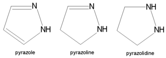 Les composés structurellement apparentés au pyrazole sont ses formes réduites, la pyrazoline et la pyrazolidine (en).