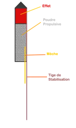 • La fusée : elle se compose d'une tige stabilisatrice et d'un tube cylindrique contenant, à la base, la poudre pour la propulsion, et au sommet, la poudre avec les effets. Lorsque la combustion de la poudre de propulsion se termine, elle met le feu aux effets.