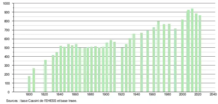 L'évolution du nombre d'habitants est connue à travers les recensements de la population effectués dans la commune depuis 1800. Pour les communes de moins de 10 000 habitants, une enquête de recensement portant sur toute la population est réalisée tous les cinq ans, les populations de référence des années intermédiaires étant quant à elles estimées par interpolation ou extrapolation[21]. Pour la commune, le premier recensement exhaustif entrant dans le cadre du nouveau dispositif a été réalisé en 2007[22].