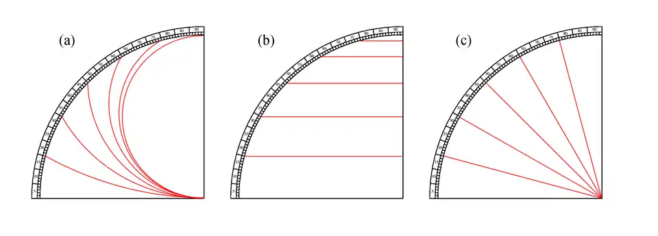 Le tracé des autres prières n'est pas représenté ici par manque d'informations. Il faut noter que ces dernières prières ne peuvent être obtenues à partir de la visée du Soleil puisqu'elles ont lieu quand ce dernier est sous l'horizon. Leur tracé sur les quadrants ottomans ne servait qu'à déterminer les instants où elles devaient être récitées.