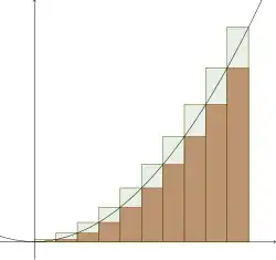 Pour calculer l'aire sous la parabole entre les points d'abscisse 0 et a, on découpe l'intervalle [0, a] en n intervalles de même taille d, mettant ainsi en évidence les abscisses . Sur l'intervalle l'aire sous la parabole est comprise entre l'aire des rectangles de base d et de hauteurs et [note 2].