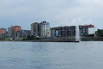 Le quai Mativa, vu depuis la rive gauche de la dérivation (parc de la Boverie) | |
