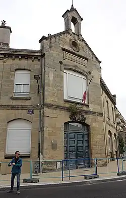 - Les bains-douches réalisés par Jacques d'Welles. Le porche d'entrée présente une mosaïque constituée d'un jeu géométrique de carreaux brun rouge et blancs et qui ceinturent la porte d'entrée en ferronnerie. Cet équipement a été mis en place dans le cadre du plan Marquet qui a permis de créditer Bordeaux d'équipements publics d'une architecture Art déco[13], comme la nouvelle Bourse du travail, la piscine judaïque, le stade Chaban-Delmas.