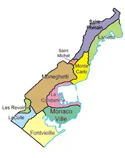 De 1911 à 1918, ces trois premiers quartiers formaient trois communes distinctes, depuis regroupées en une unique commune de Monaco qui occupe tout le territoire de la principauté.