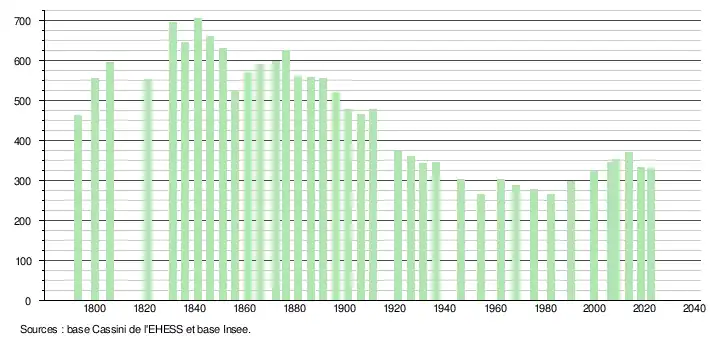 L'évolution du nombre d'habitants est connue à travers les recensements de la population effectués dans la commune depuis 1793. Pour les communes de moins de 10 000 habitants, une enquête de recensement portant sur toute la population est réalisée tous les cinq ans, les populations de référence des années intermédiaires étant quant à elles estimées par interpolation ou extrapolation[21]. Pour la commune, le premier recensement exhaustif entrant dans le cadre du nouveau dispositif a été réalisé en 2008[22].