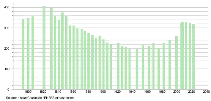 L'évolution du nombre d'habitants est connue à travers les recensements de la population effectués dans la commune depuis 1793. Pour les communes de moins de 10 000 habitants, une enquête de recensement portant sur toute la population est réalisée tous les cinq ans, les populations de référence des années intermédiaires étant quant à elles estimées par interpolation ou extrapolation[17]. Pour la commune, le premier recensement exhaustif entrant dans le cadre du nouveau dispositif a été réalisé en 2007[18].
