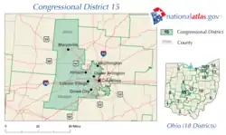 Le 15e district congressionnel de l'Ohio est actuellement représenté par le Républicain Mike Carey. Il était représenté par le Républicain Steve Stivers de 2011 au 16 mai 2021, date à laquelle il a démissionné pour devenir président-directeur général de la Chambre de Commerce de l'Ohio[1]. Le district comprend tout le comté de Franklin qui ne fait pas partie du 3e district, y compris Grove City, Hilliard et Dublin. Il s'étend ensuite pour s'emparer des territoires suburbains et périurbains entre la capitale de l'État, Columbus, et Dayton, ainsi que des territoires plus ruraux au sud de Columbus.