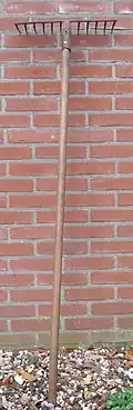 - Râteau-étrier ou râteau à feuilles : utilisé pour ramasser les feuilles et servant de scarificateur manuel.