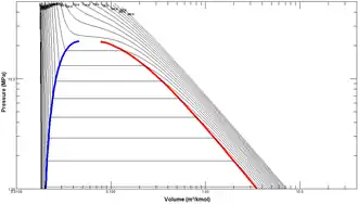 - Au point d'intersection du plateau et de la courbe bleue, le liquide a un volume molaire . Au point d'intersection du plateau et de la courbe rouge, le gaz a un volume molaire . Ces deux points sont aux mêmes pression et température et donnent les volumes molaires des deux phases liquide et gaz lorsqu'elles sont en équilibre dans ces conditions. On considère un point quelconque sur le plateau ; ce point représente un équilibre liquide-vapeur de volume molaire tel que . En ce point, la fraction de liquide vaut :