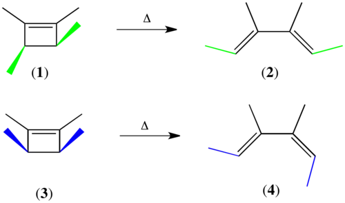 Les règles de Woodward–Hoffmann sont d'abord proposées afin d'expliquer la stéréospécificité frappante des réactions électrocycliques, sous contrôle soit thermique soit photochimique. La thermolyse du cyclobutène substitué trans-1,2,3,4-tétraméthylcyclobutène (1) ne produit qu'un seul isomère géométrique, le (E,E)-3,4-diméthyl-2,4-hexadiène (2) indiqué; les isomères géométriques (Z,Z) et (E,Z) ne sont pas trouvés comme produits de réaction. De même, la thermolyse de cis-1,2,3,4-tetramethylcyclobutene (3) ne forme que l'isomère géométrique (E,Z)(4)[1].