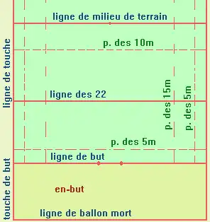 Les lignes de touche d'un terrain de rugby sont considérées comme ne faisant pas partie de l'aire de jeu. Ainsi, lorsqu'un joueur marche sur une de ces lignes, il est en touche. À l'inverse, la ligne de but fait partie de l'en-but (tout comme les poteaux), ce qui permet à un joueur aplatissant le ballon sur cette ligne de valider un essai. Enfin, la ligne de ballon mort ne fait pas partie du terrain et aucun essai ne peut être marqué si le ballon est aplati sur cette ligne.