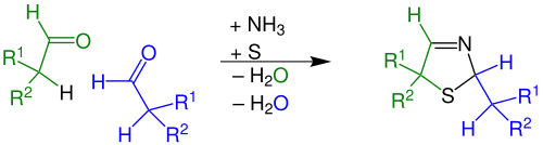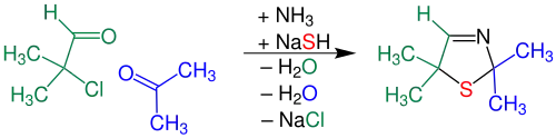 L'α-mercaptocétone réagit de manière irréversible avec un aldéhyde et de l'ammoniac pour former une 3-thiazoline : L'aldéhyde est ici l'autre composé carbonyle dans la réaction de cyclisation. Il s'agit d'une α-amino-alkylation d'un atome du carbone lié à S et O et donc polarisé et, pour encore plus de stabilisation, d'une cyclisation concertée avec le départ d'une molécule d'eau. Finalement une seconde déshydratation transforme la 3-thiazolidine en 3-thiazoline.