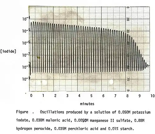 La réaction montre des changements récurrents périodiques, à la fois graduels et soudains, qui sont visibles : changements lents de l'intensité des couleurs, interrompues par de brusques changements de teinte. Cela démontre qu'une combinaison complexe de réactions lentes et rapides se déroule simultanément. Par exemple, le suivi de la concentration en ions iodure avec une électrode d’argent/iodure d'argent[6] (voir les vidéos) montre des sauts soudains de plusieurs ordres de grandeur séparés par des variations plus lentes. Ceci est représenté par l'oscillogramme ci-dessus. Les oscillations persistent sur une large gamme de températures. Des températures plus élevées accélèrent tout le processus, avec quelques changements qualitatifs observables (voir effet de la température). L’agitation de la solution pendant toute la réaction permet d’obtenir des changements de couleur nets, sinon des variations spatiales peuvent se développer (voir les vidéos). Des bulles d'oxygène libre évoluent tout au long de la réaction, et dans la plupart des cas, l'état final est riche en iode libre.