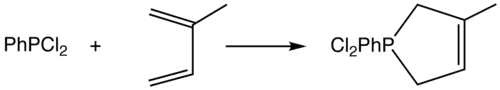 Dans cette cycloaddition, un phospholène est formé à partir de buta-1,3-diène et d'un dichlorophosphane :