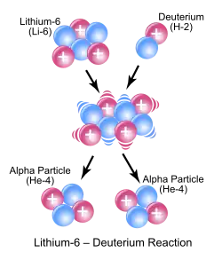 La réaction précédemment discutée intervient dans la fusion de l'hélium ; le 6Li et le deutérium réagissent en formant un noyau atomique intermédiaire, très excité, de 8Be, qui se désintègre très vite en produisant deux particules alpha. La figure suivante illustre cette réaction, les protons sont représentés par des sphères rouges, et les neutrons, par des sphères bleues.