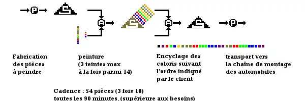 Le schéma 4 représente les étapes successives du processus de production du « cas A » de cette étude. Le fournisseur de pièces peintes dispose de moyens suffisants en capacité, c’est-à-dire que la chaîne de montage automobile qu'il approvisionne avance à une cadence inférieure à 54 pièces toutes les 90 minutes. Il crée cependant des ruptures dans l'approvisionnement de cette chaîne bien que disposant d'un stock de pièces peintes de 2 fois 18 pièces dans chaque couleur. Bien que disposant de prévisions de ventes et de commandes fermes sur plusieurs jours de production, ce fournisseur travaille en appel par l'aval, en kanban. Les défauts de qualité ont été introduits dans les données d'une simulation qui montre qu'il peut réduire son stock de pièces peintes à 1 fois 18 pièces de chaque couleur (division du stock par 2) sans jamais mettre son client en rupture, à condition de connaître l'encyclage 9 ou 10 cycles de 90 minutes à l'avance. La production est encyclée, c’est-à-dire que les pièces sont livrées à la chaîne de montage final des automobiles dans l'ordre décidé par le constructeur (une voiture rouge, une verte, une blanche, etc.). Cet ordre est lui-même déterminé pour lisser la charge de travail de chaque poste d'assemblage de la chaîne en fonction des variantes de modèles des véhicules commandés (par des clients ou pour le stock). Les simulations déterminent en fait que le stock mini est dû à la non-qualité, sachant qu'à qualité parfaite (pas de rebut ou de retouche) il suffit de connaître la production 7 fois 90 minutes à l'avance (anticipation ou commande ferme) pour livrer dans les délais. (Cycle de peinture de 90 minutes, cycle d'encyclage des commandes 90 minutes, 14 couleurs, 3 couleurs simultanées au maximum). Le point de pénétration des commandes doit donc se situer avant la peinture et non au niveau du stock de pièces peintes, d'autant plus que les commandes sont connues !