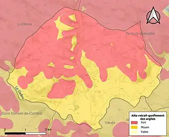 La commune est vulnérable au risque de mouvements de terrains constitué principalement du retrait-gonflement des sols argileux[25]. Cet aléa est susceptible d'engendrer des dommages importants aux bâtiments en cas d’alternance de périodes de sécheresse et de pluie. La totalité de la commune est en aléa moyen ou fort (76,3 % au niveau départemental et 48,5 % au niveau national). Sur les 1 488 bâtiments dénombrés sur la commune en 2019, 1 488 sont en aléa moyen ou fort, soit 100 %, à comparer aux 90 % au niveau départemental et 54 % au niveau national. Une cartographie de l'exposition du territoire national au retrait gonflement des sols argileux est disponible sur le site du BRGM[26],[Carte 3].