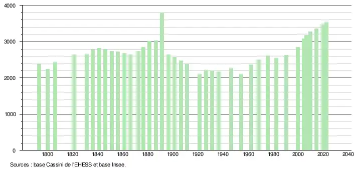 | L'évolution du nombre d'habitants est connue à travers les recensements de la population effectués dans la commune depuis 1793. Pour les communes de moins de 10 000 habitants, une enquête de recensement portant sur toute la population est réalisée tous les cinq ans, les populations de référence des années intermédiaires étant quant à elles estimées par interpolation ou extrapolation[31]. Pour la commune, le premier recensement exhaustif entrant dans le cadre du nouveau dispositif a été réalisé en 2004[32]. En 2022, la commune comptait 3 542 habitants[Note 5], en évolution de +4,7 % par rapport à 2016 (Tarn : +2,52 %, France hors Mayotte : +2,11 %). |