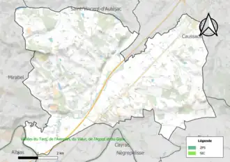 Le réseau Natura 2000 est un réseau écologique européen de sites naturels d'intérêt écologique élaboré à partir des directives habitats et oiseaux, constitué de zones spéciales de conservation (ZSC) et de zones de protection spéciale (ZPS)[Note 2]. Un site Natura 2000 a été défini sur la commune au titre de la directive habitats : Les « vallées du Tarn, de l'Aveyron, du Viaur, de l'Agout et du Gijou »[18], d'une superficie de 17 144 ha, s'étendant sur 136 communes dont 41 dans l'Aveyron, 8 en Haute-Garonne, 50 dans le Tarn et 37 dans le Tarn-et-Garonne. Elles présentent une très grande diversité d'habitats et d'espèces dans ce vaste réseau de cours d'eau et de gorges. La présence de la Loutre d'Europe et de la moule perlière d'eau douce est également d'un intérêt majeur[19].