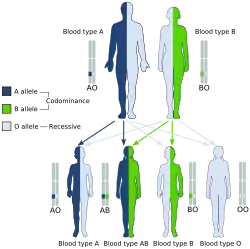 Un exemple de codominance est l'hérédité des caractéristiques des groupes sanguins A et B dans le système ABO. Si une personne a hérité de la constitution génétique du groupe sanguin A d'un parent et de celle du groupe sanguin B de l'autre parent, ses globules rouges ont à la fois les antigènes A et B. Son groupe sanguin est donc AB. En revanche, si les allèles sont hétérozygotes, l'hérédité est dominante / récessive pour A et O ainsi que pour B et O. Les caractéristiques A et B prévalent sur O, l'absence des deux antigènes. Parce que la présence de l'allèle dominant respectif sur un seul chromosome de la paire de chromosomes est suffisante pour former les antigènes correspondants. Un autre exemple de codominance est le système de groupe sanguin MNS moins connu[12].