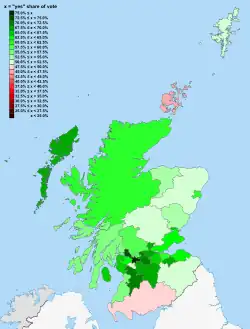 Elle est remportée à 63,5 % avec 1 512 889 votes favorables contre 870 263 votes défavorables. L'approbation des deux questions a débouché sur le Scotland Act de 1998, et la création d'un gouvernement et un parlement écossais de dévolution.