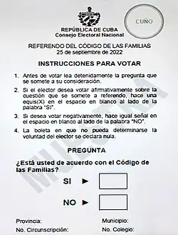 La question posée est « Êtes-vous d’accord avec le code de la famille ? » (en espagnol : « ¿ Está usted de acuerdo con el Código de las Familias ? »). Le vote est obligatoire et ouvert dès seize ans[23]. Le référendum ne nécessite pas de majorité qualifiée ou de quorum de participation : seule la majorité absolue des suffrages exprimés est exigée pour en valider le résultat[24],[25]. C'est la première fois dans l'histoire du pays que la population cubaine a la possibilité de s'exprimer par référendum sur un texte de loi, les précédents ayant tous porté sur des textes constitutionnels[26].