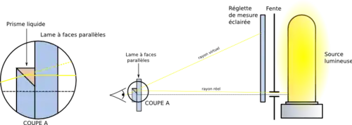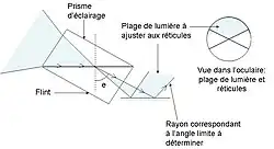 Comme il n'est pas possible d'avoir un unique rayon rasant qui rentre au bon endroit dans le support matériel sous-jacent, le dispositif met en jeu un faisceau de lumière dont la limite est, par construction, le rayon rasant. Ce pinceau lumineux est réalisé à l'aide du prisme supérieur. Ce faisceau constitue la plage de lumière dont la limite sera ajustée au réticule et sera la base de la mesure.