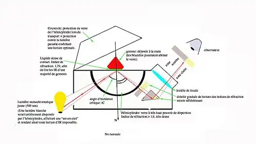 L'indice de réfraction d'une pierre fine, comme les gemmes, est une donnée pertinente. Il faut que la pierre ait au moins une face plane et polie. Le réfractomètre d'Abbe conçu pour les liquides doit être adapté (voir figure ci-contre)