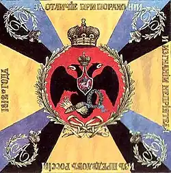- En 1797, le régiment se voit remettre une nouvelle bannière qui se compose d'une croix de Saint-Georges blanche, les angles étant de couleur bleue. On trouve en son centre un médaillon de couleur orangée, en son milieu, l'aigle bicéphale noir surmonté de la couronne impériale de Russie, avec sur son ventre un écusson de couleur rouge entouré d'une couronne de laurier vert[19].