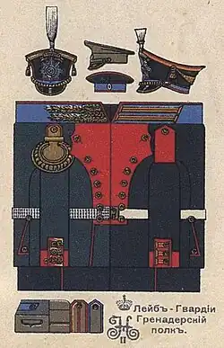 Le régiment des grenadiers de la garde, (En langue russe : лейб-гвардии Гренадерский полк) est un régiment de l'Empire russe. C'est par le décret du , que l'impératrice Élisabeth Ire de Russie ordonna la création de quatre régiments de grenadiers, le comte Roumiantsev recevant la mission de former le 1er régiment des grenadiers de grenadiers[2]. Il fut doté de deux bataillons, de cinq compagnies et d'un groupe d'artilleurs. Cette unité militaire fut constituée à partir de la 3e compagnie de grenadiers des régiments suivants : (régiment d'infanterie de Kiev, régiment d'infanterie de Kazan, régiment d'infanterie de Nijni-Novgorod, régiment d'infanterie de Tchernigov, régiment d'infanterie de Souzdal, régiment d'infanterie d'Ouglitch, régiment d'infanterie de Mourom, régiment d'infanterie de Keksgolm, régiment d'infanterie d'Arkhangelsk et le régiment de Vologda). La fête de ce régiment fut fixée au , jour anniversaire de la naissance de l'impératrice[3].