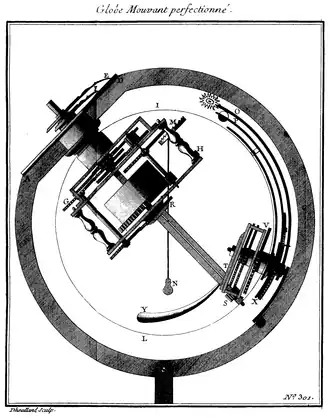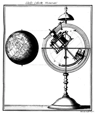 • le globe céleste mouvant, en cuivre [ou laiton], dont l'axe des pôles est incliné sur l'horizon de 49°, sensiblement la latitude de Paris. Il tourne autour de son axe en un jour sidéral, soit 23 h 56 min 04 s. « Sur ce globe sont gravées la plupart des étoiles fixes avec les constellations et tous les cercles de la sphère. » La Terre est supposée être au centre du globe ;