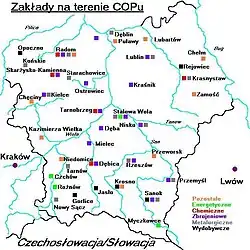 Quoi qu'il en soit, le démembrement allemand de la Tchécoslovaquie a débordé la Pologne par le sud et a placé la majorité des usines COP sur la trajectoire directe de l'avancée allemande depuis la Slovaquie. Pendant l'occupation allemande, la plupart des usines ont été converties pour contribuer à l'effort de guerre allemand.