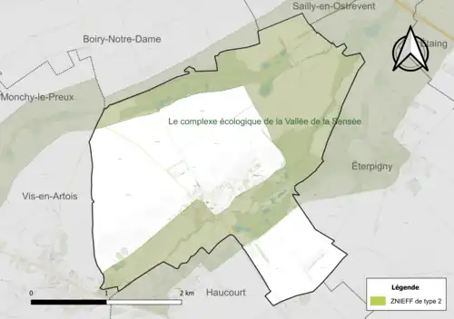 Le territoire communal comprend une ZNIEFF de type 2[Note 3] : le complexe écologique de la vallée de la Sensée. Cette ZNIEFF s’étend sur plus de 20 kilomètres depuis les communes de Rémy et Haucourt jusqu’à la confluence de la rivière canalisée avec l’Escaut. Elle forme une longue dépression à fond tourbeux, creusée entre des plateaux aux larges ondulations ; Ostrevent au Nord, bas-Artois au Sud et Cambrésis à l’Est[16].