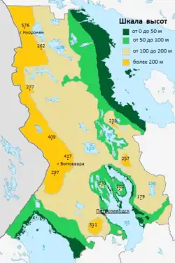 La périphérie nord-ouest, où se trouve la chaîne morainique de Maanselkä, est la zone la plus élevée, avec des altitudes variant de 300 à 400 m. C'est ici que se trouve le point culminant : le Nuorunen, qui culmine à 577 mètres. Au sud de celle-ci se trouve le plateau de Carélie occidentale (ru), avec des altitudes comprises entre 180 et 300 mètres. Ce plateau est composé de trois crêtes (occidentale, centrale et orientale). La crête centrale est la plus haute avec le Mont Vottovaara et ses 413 mètres, point culminant du plateau[15].