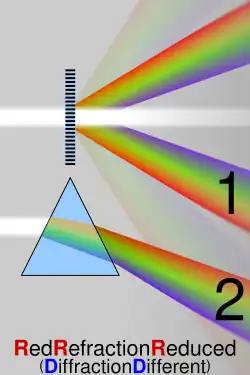 Comparaison de la division angulaire des longueurs d'onde (couleurs) de la lumière blanche par réseau de diffraction (1), et par prisme (2). Les longueurs d'onde plus longues (rouge) subissent une diffraction plus forte, mais une réfraction plus faible que les longueurs d'onde plus courtes (violet).