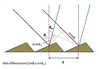 Soit n1 l'indice du milieu de propagation de l'onde incidente (de longueur d'onde λ). Soit θi l'angle d'incidence et θm l'angle de réflexion pour lequel on a une interférence constructive. Soit d le pas du réseau et m un nombre entier. Comme on peut le déduire en regardant le schéma du réseau réflectif, il y a des interférences constructives si